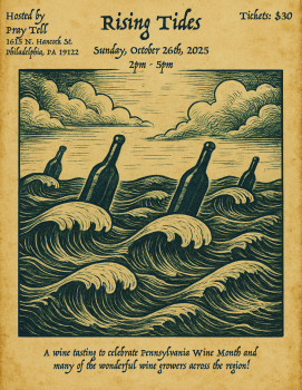 Pennsylvania has an amazing community of winegrowers across the state and we're so excited to host our first ever Rising Tides Tasting Event. Come taste over 20 different Pennsylvania grown and made wines and speak with the wonderful folks who make them! We'll be joined by Waltz Vineyard, WayVine, Therein, Mural City Cellars, and more!