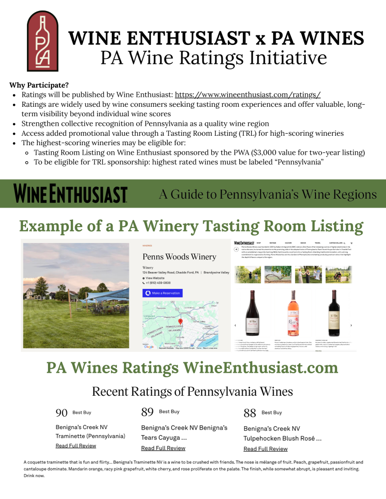 To increase the visibility and credibility of Pennsylvania-grown and produced wines through Wine Enthusiast’s respected national and global platform—driving long-term value for participating wineries and strengthening Pennsylvania’s reputation as a quality-focused wine region and travel destination. Wine ratings provide national exposure and third-party validation that can be leveraged in tasting rooms, marketing materials, media outreach, and wholesale conversations. This is a continued step in recognizing the quality wines that are grown and produced in Pennsylvania.